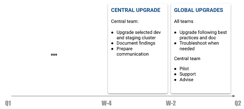 Following the initial testing phase and usually in the last two weeks of the quarter, the central team oversees the upgrade process for all clusters and applications. Implementing such a structured timeline serves multiple purposes: it ensures that each team allocates dedicated time for the upgrade, thereby providing the central team with the necessary resources to support and manage the process effectively.
