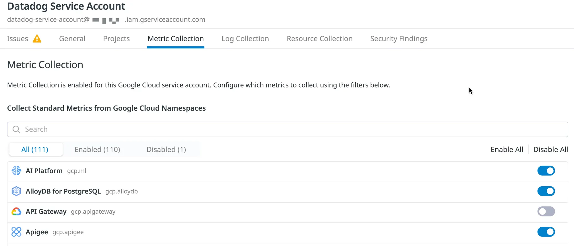 To control costs on GCP, you can limit metric collection by namespace. Similar to AWS, you can choose which services to collect data from, reducing the number of API calls made by the Datadog crawler and, in turn, minimizing the potential GCP API charges.