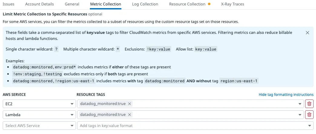The Datadog Billing is related to the number of monitored assets such as hosts or lambdas. For large AWS accounts, it may be relevant to exclude some assets from being monitored. https://docs.datadoghq.com/account_management/billing/aws/#aws-resource-exclusion For this reason, it is possible to use tags to limit the resource collection.