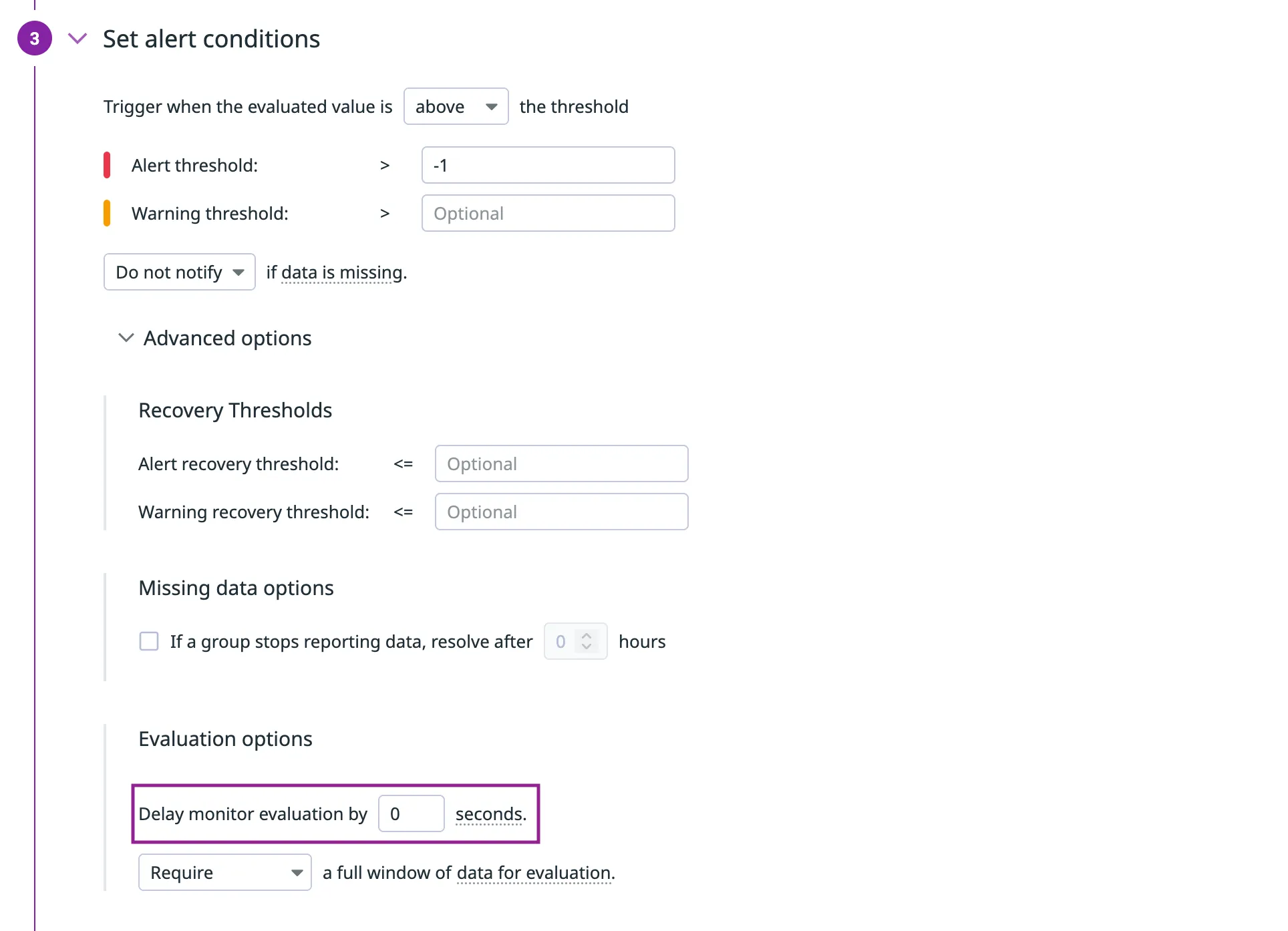 This ensures that your monitor doesn’t evaluate incomplete data, which can lead to false positives or missed alerts. For critical production alerts, you can set lower delays but should design your monitors to handle potential data gaps