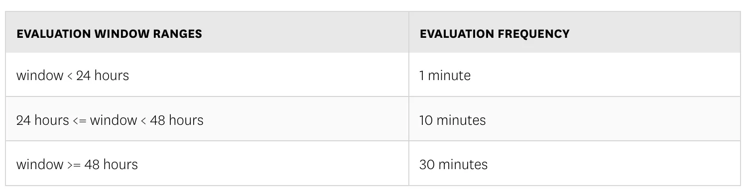 These two settings are closely linked in Datadog: longer windows typically lead to less frequent evaluations. But keep in mind, even with a one-hour window, Datadog still checks conditions every minute. Learn more.