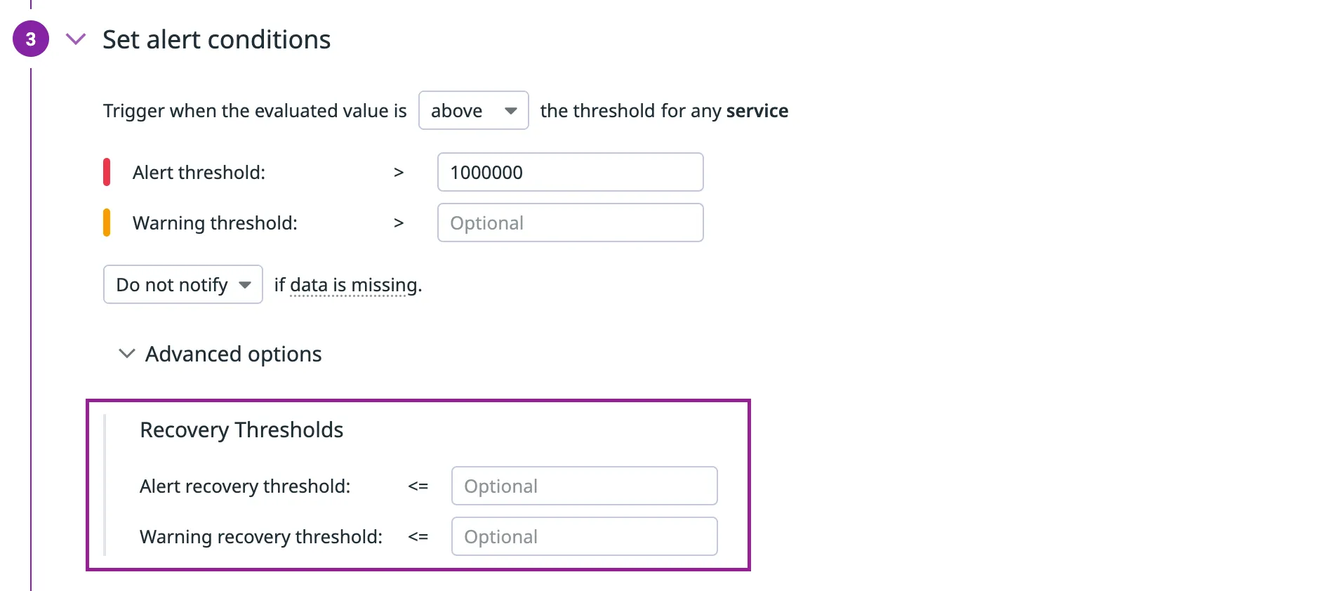 A recovery threshold adds an extra condition for when an alert can resolve—ensuring the system is truly healthy before clearing. Learn more.