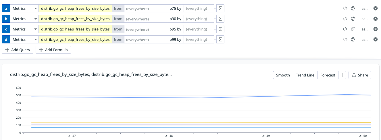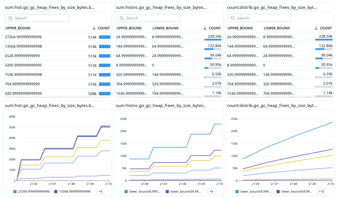 This also means that if upper_bound is not selected, Datadog will perform a spatial aggregation across all upper_bound, the value then provided is meaningless since we would count multiple times each go_gc_heap_frees measurement.