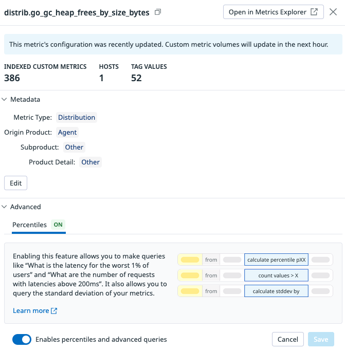 We limited the scope to just three metric names to keep our custom metric bill from ballooning. (Pro tip: resist the temptation to go full regex with .+—unless all metrics are important but often enough you have some unnecessary metrics that just increase your costs.)